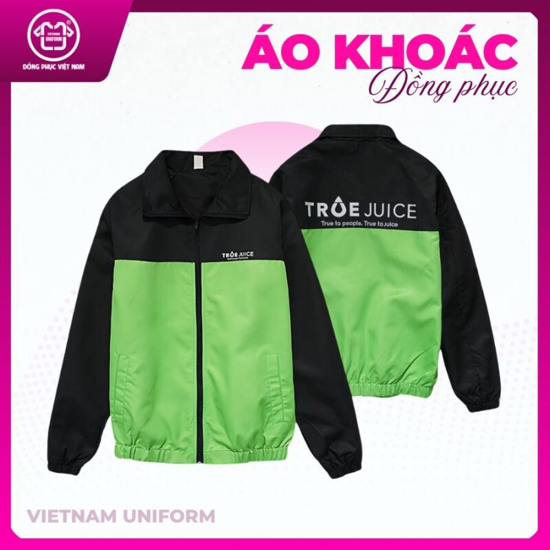 Mẫu áo khoác đồng phục tone đen phối xanh lá nổi bật, tạo nên hình ảnh hiện đại và chuyên nghiệp cho thương hiệu. Thiết kế dáng suông năng động, form unisex phù hợp cho cả nam và nữ. Logo in trắng rõ nét phía trước ngực và phía sau lưng giúp nâng cao độ nhận diện thương hiệu. Đây là mẫu áo lý tưởng cho các doanh nghiệp hoạt động trong lĩnh vực thực phẩm, đồ uống, dịch vụ hoặc team building, sự kiện ngoài trời.