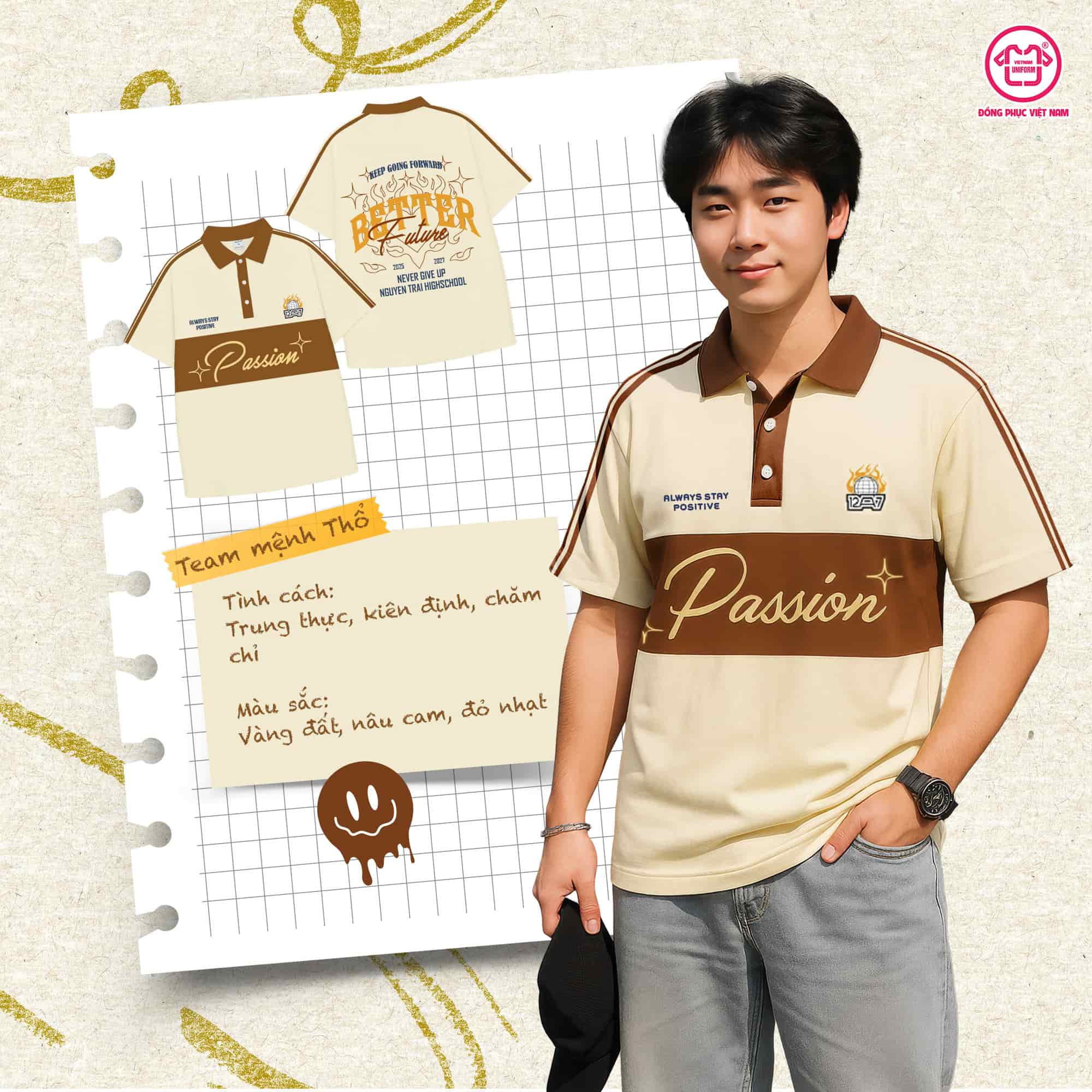 Gợi ý thiết kế: Chọn màu nâu đất trầm ấm hoặc cam đất trẻ trung, kết hợp chi tiết đỏ hoặc hồng sẽ vừa hợp mệnh lại vừa tạo ấn tượng mạnh mẽ cho đồng phục áo lớp của bạn.