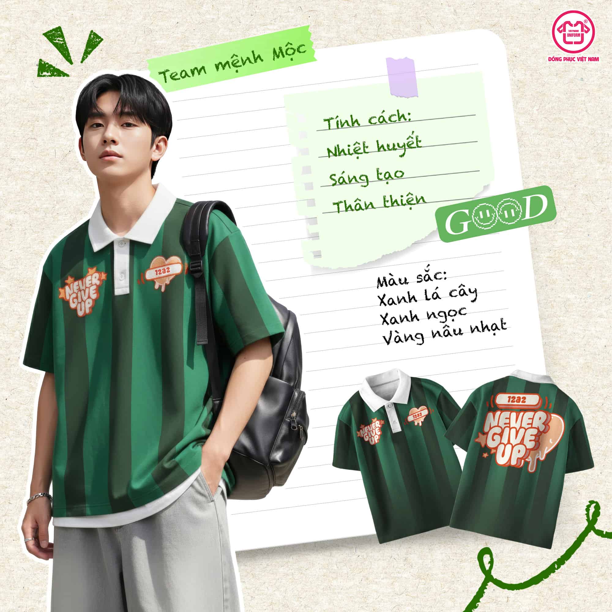 Gợi ý thiết kế: Đồng phục áo lớp xanh lá cây đậm hoặc xanh cổ vịt, kết hợp cùng các chi tiết xanh dương sẽ tạo nên một tổng thể trẻ trung, đầy sức sống.