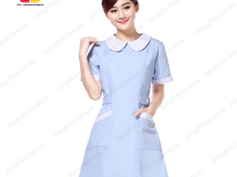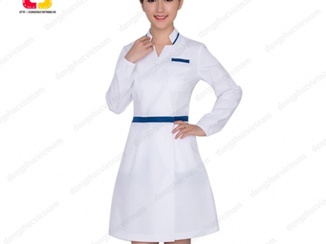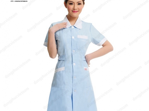 Ngoài ra kiểu áo liền váy cũng là một trong các kiểu đồng phục y tá hiện nay. Nó thường được trang bị cho nữ hộ sinh hay các điều dưỡng viên nữ. Về kiểu dáng, nó có cổ 2 ve, ống tay áo dài hoặc ngắn tùy từng vị trí. Phần vái có chiều dài quá gối từ 5 – 10 cm. Phía trước áo có 3 túi (2 túi 2 bên và 1 túi ngang trên ngực). Viền ở tay áo và cổ áo có màu xanh dương và có kích thuocs 0.5 cm
