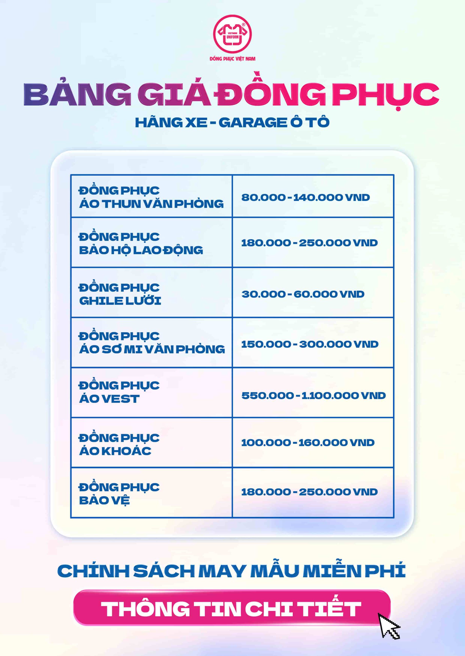 Nhằm giúp bạn có thêm nhiều nội dung hữu ích, bên dưới là bảng giá đồng phục hãng xe, cùng tham khảo nhé: