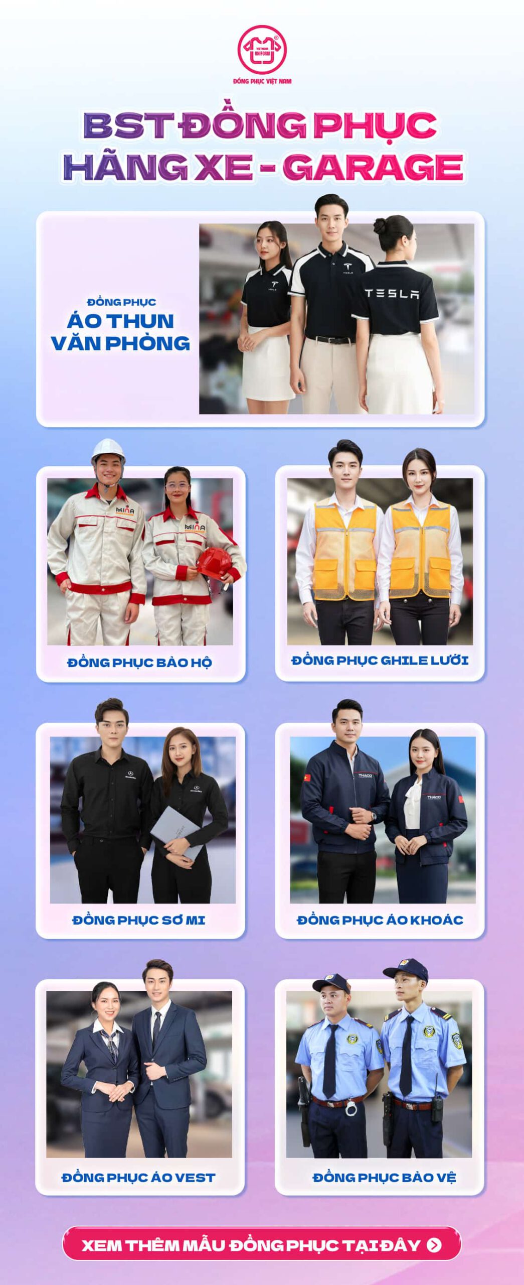 Dưới đây là những hạng mục đồng phục phổ biến và quan trọng nhất dành cho các hãng xe: